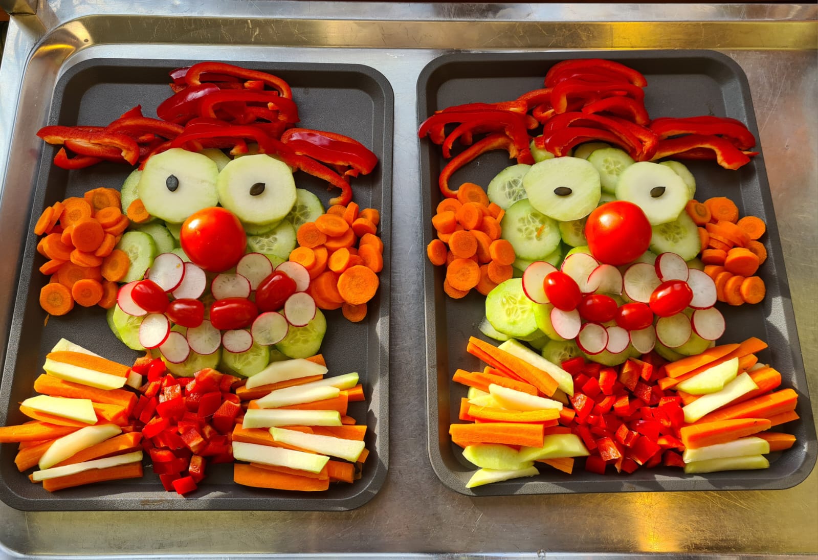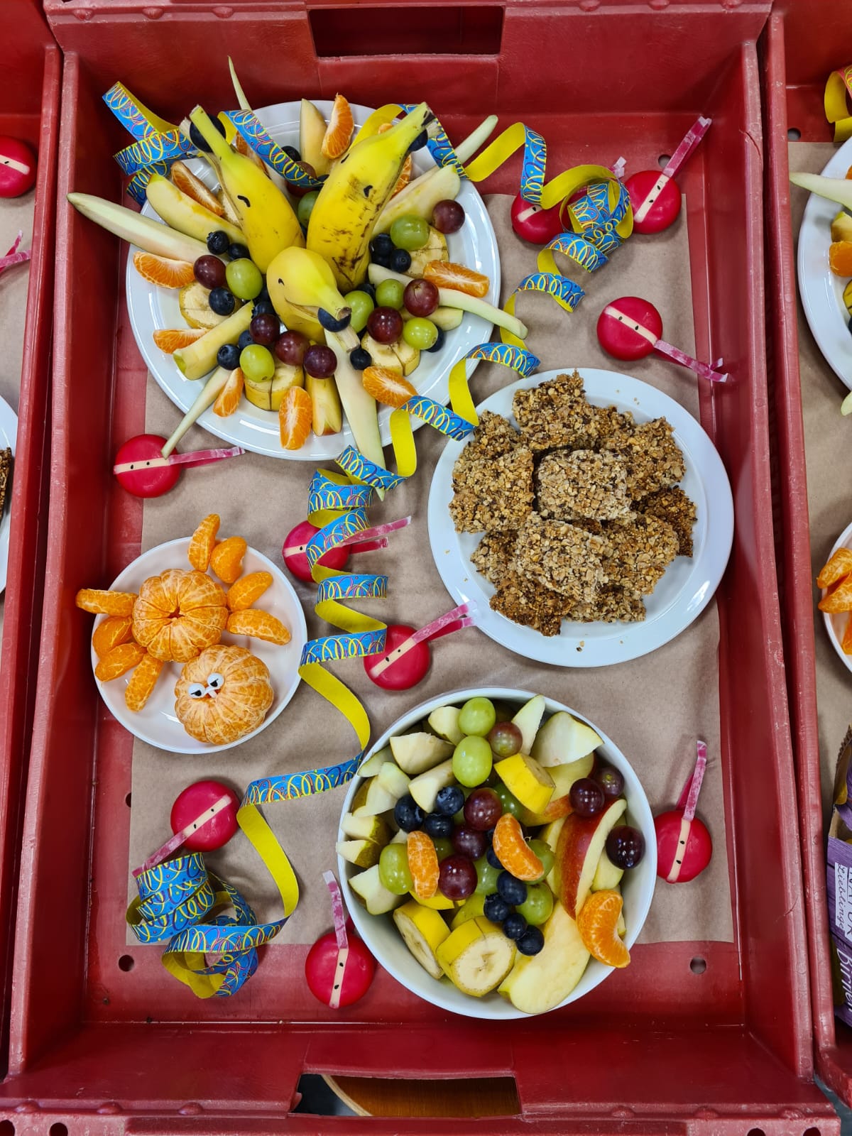 Lustige Clownsgesichter auf feinem Dinkelbrot wurden gestaltet, dazu gab es einen kunterbunten Gemüseclown. Für die „Süßen“ war natürlich auch wieder etwas dabei und es durften Bananen-Delfine probiert werden, die in einem bunten Obstsalat schwammen. Das Highlight waren neben den heldenhaften kleinen Käse-Ninjas dieses Mal auf jeden Fall die leckeren selbstgebackenen Müsliriegel aus Hafer- und Dinkelflocken zusammen mit allerlei Kernen und Saaten.