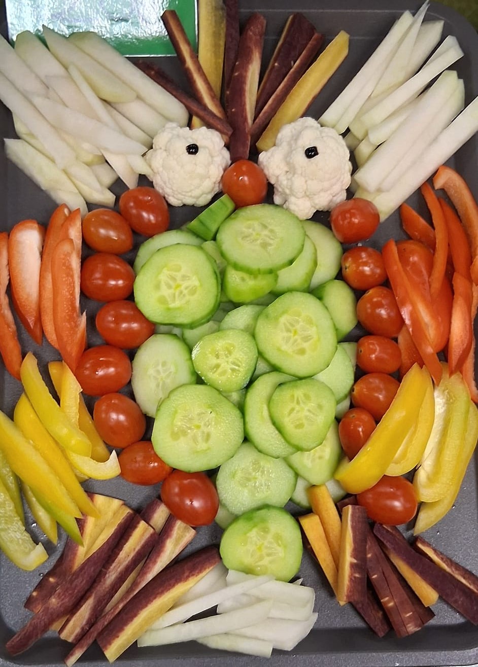 Neben den immer beliebten bunt belegten Broten gab es dieses Mal leckere Käse-Igel, süße Mandarinen-Kürbisse, Joghurt und kleine Laugen-Kastanien. Das Highlight bildete die bunte Gemüse-Eule, ausschließlich aus heimischem Gemüse, welches dem Förderverein von der Gemmrigheimer Gärtnerei Beckbissinger zur Verfügung gestellt wurde.
